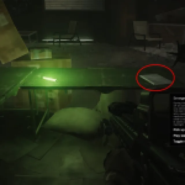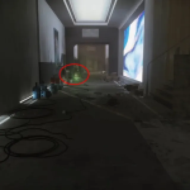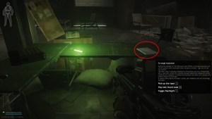 You start in the Terragroup building in the lobby. Head immediately to the desk at the center and loot all the healing items. Loot the tape on top of the white notebook. Press “M” to play the tape and advance to the next objective.