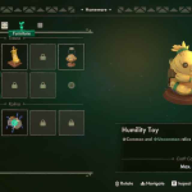 For example, if you are just starting, you will mostly receive common and uncommon relics, so the Humility Toy is the perfect piece of furniture to place in the shop because it boosts sales for common and uncommon relics by 100 percent.